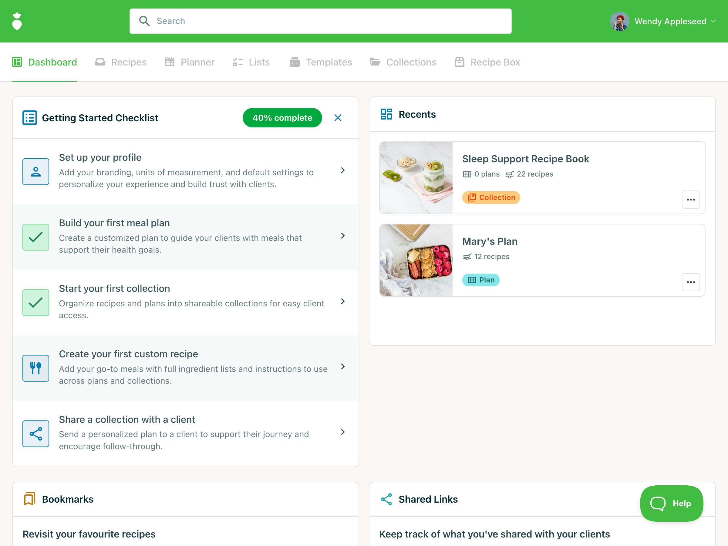 Click through each item in the Getting Started Checklist to explore key features, such as building meal plans and creating collections. As you complete each step, the checklist will track your progress and tuck itself away once everything is done.