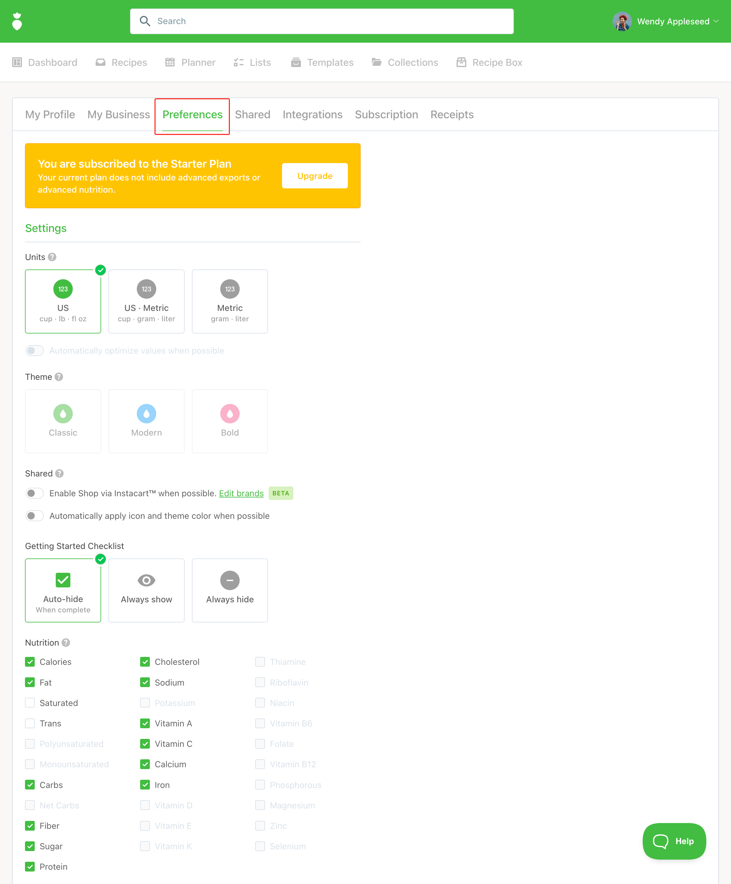 Preferences: Set your preferred units of measure and choose which nutrients you'd like to display in Recipes and Planner. Some nutrients will appear greyed out — these are available on the Plus plan only. For a full breakdown of what's included in each plan, see our Plan Comparison article.