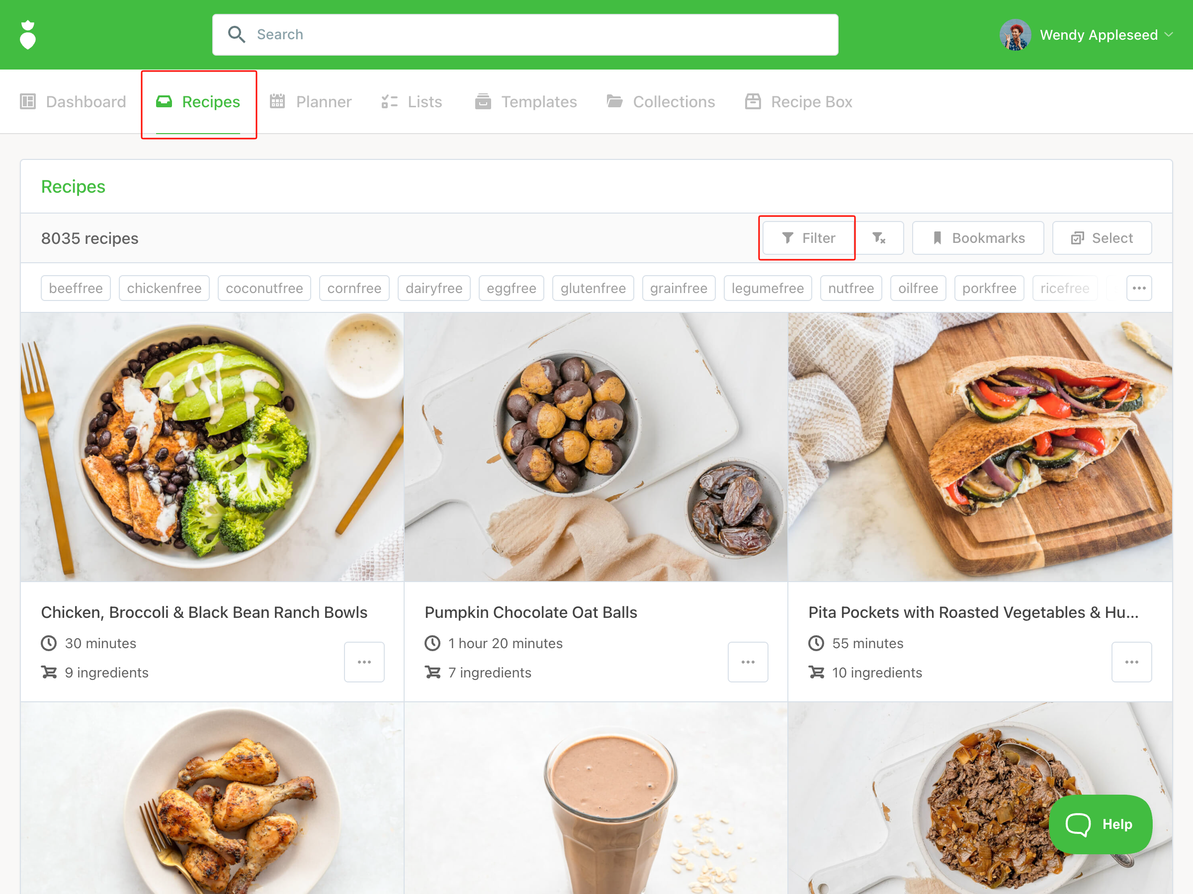 Once created, head to the Recipes tab and use filters to find the right recipes.