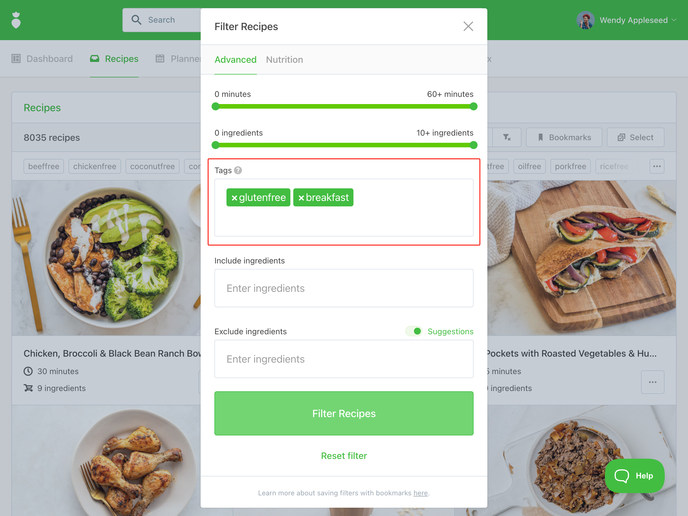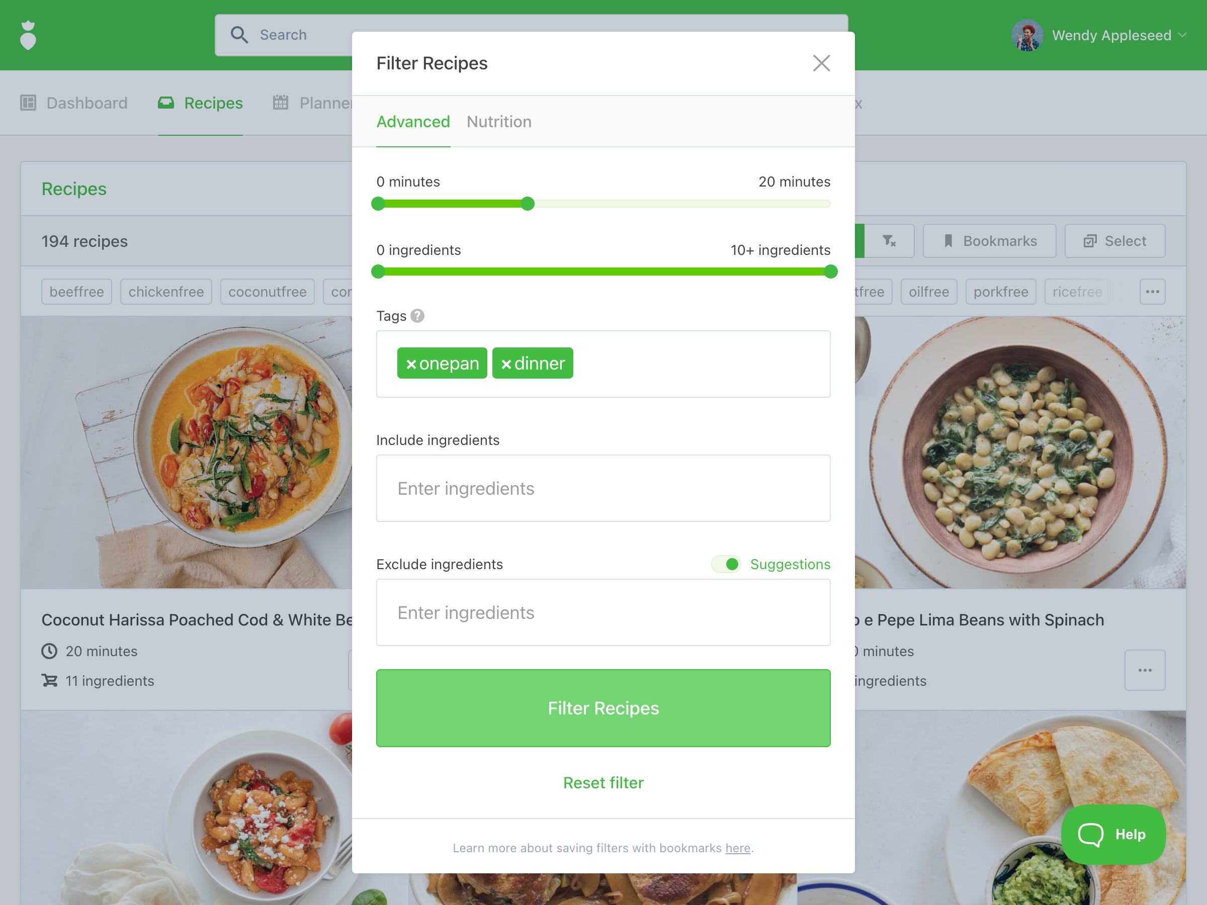 If you'll be using the same filter combination regularly, save it as a Bookmark to apply it instantly in the future. Bookmarks can be saved directly from the Filter Recipes panel on the Recipes page. See our Bookmarks article to learn more.