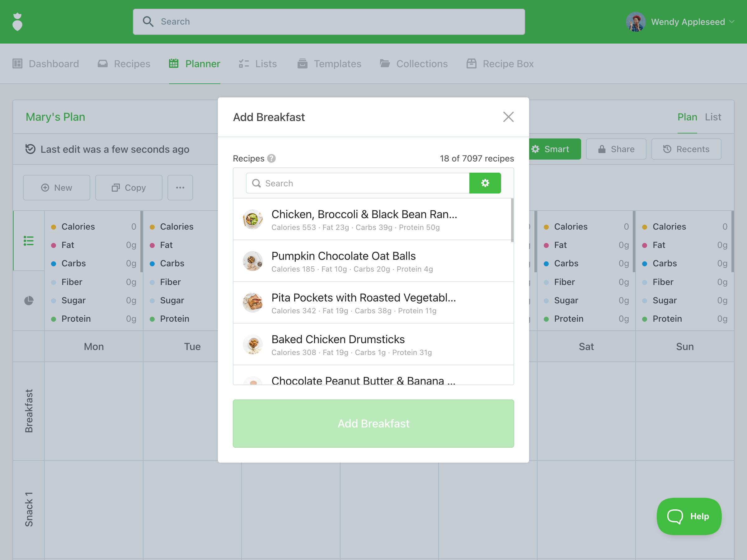 To add a recipe: Click into an open meal slot and use the search box, or head to the Recipes tab, apply your filters, and add recipes from there.