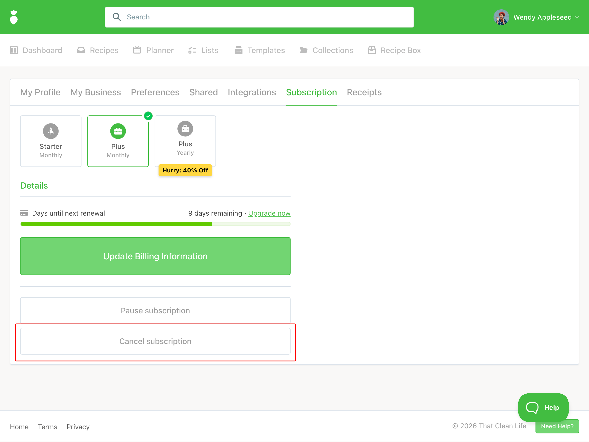 - Your subscription details will update and you will receive an email to confirm the cancellation. If you do not receive a confirmation email please reach out to support@thatcleanlife.com.